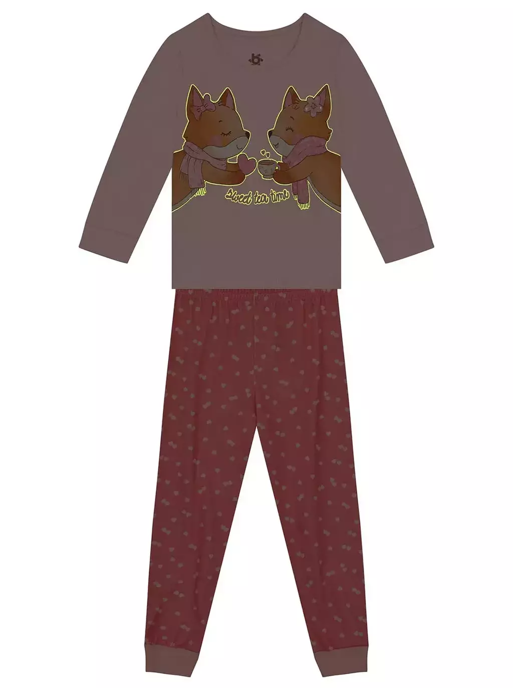 Desperte a imaginação da sua menina com o encantador pijama infantil da Brandili! Confeccionado em malha macia, este conjunto é ideal para o conforto na hora de dormir. A blusa estampada com uma adorável raposa que brilha no escuro traz um toque divertido e encantado, enquanto a gola redonda e os punhos ajustados garantem um caimento perfeito. Acompanhada por uma calça com estampa delicada e cós elástico, este look é perfeito para aventuras e brincadeiras noturnas. Sua pequena vai adorar brilhar!